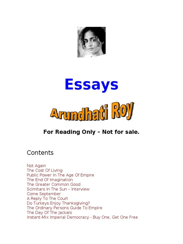 Others take some stand and become outrageous supporters of their views. Critical analysis of arundhati roys come september. Come september transcript of speech on 18 september 2002 and conversation with howard zinn archive of arundhati roy on democracy now. It attempts to put the terrorism of 9 11 into a wider perspective.